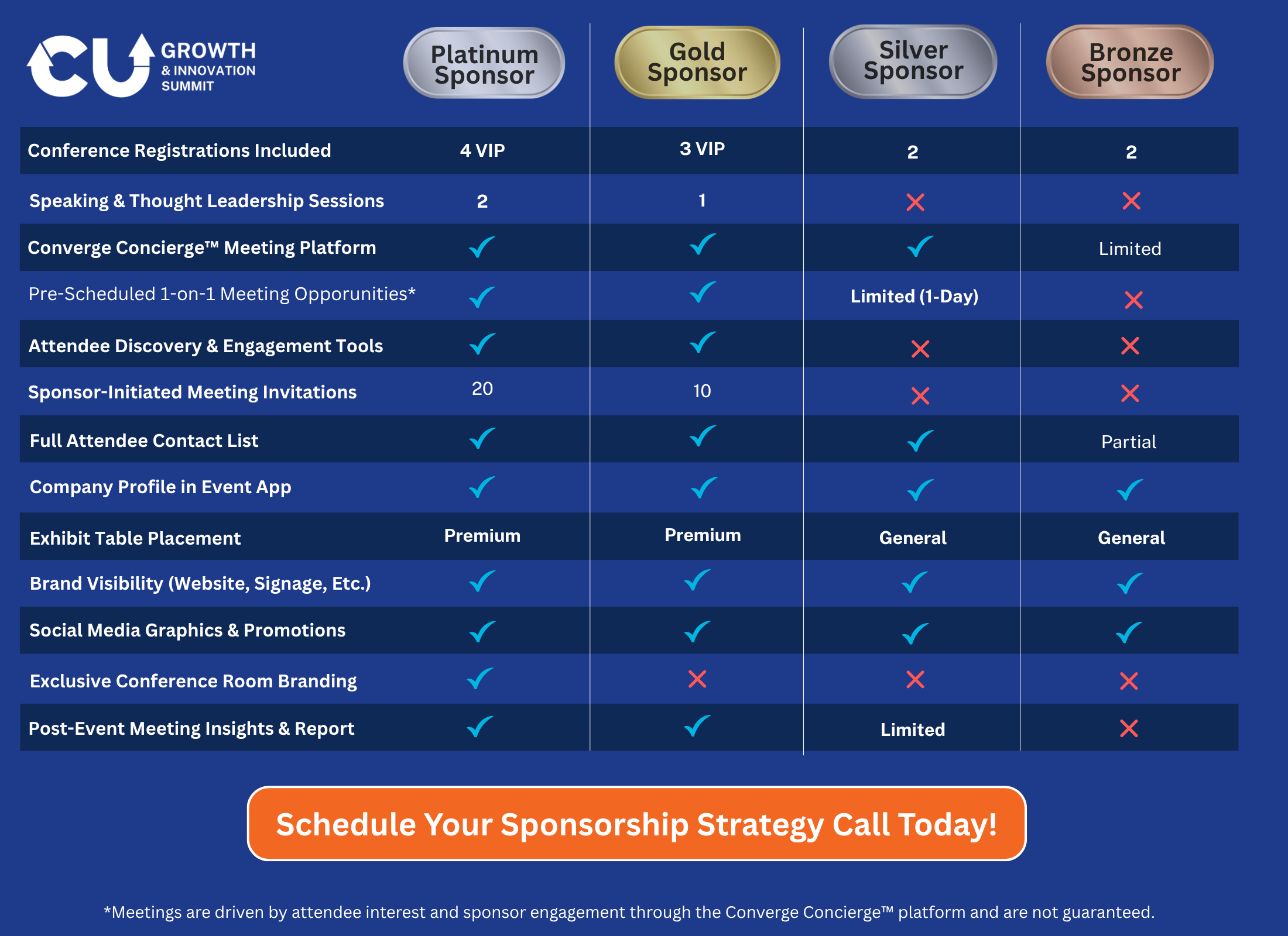 Converge Events is designed to go beyond traditional sponsorship models by helping sponsors generate qualified meetings with the right attendees. Through the Converge Concierge™ platform, sponsors gain structured access to decision-makers before and during the event, enabling targeted outreach, scheduled meetings, and inbound engagement.